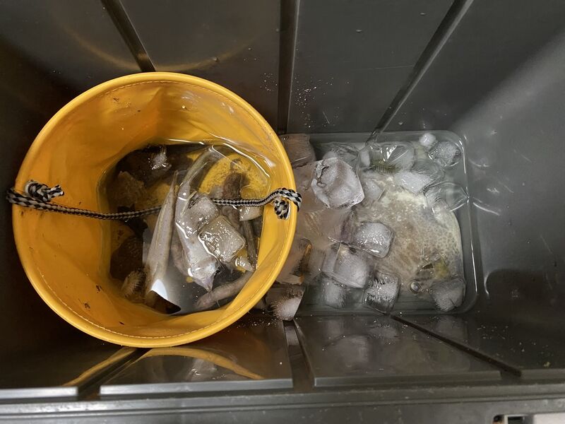 さあ釣るぞー... 時間まで粘った結果は、私も母パンダさんも残念なことにフグでした。フグは食べられませんからリリースしました。