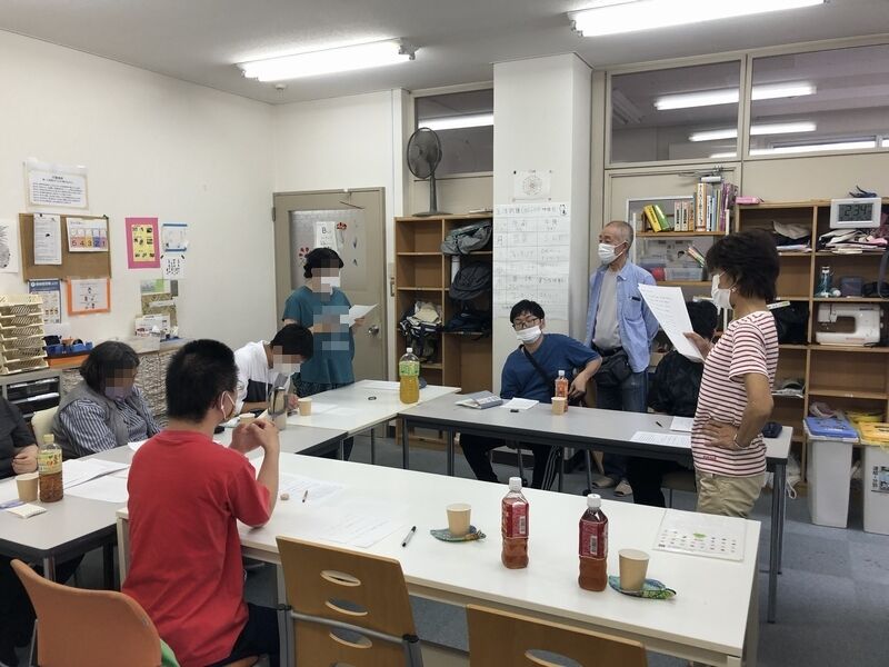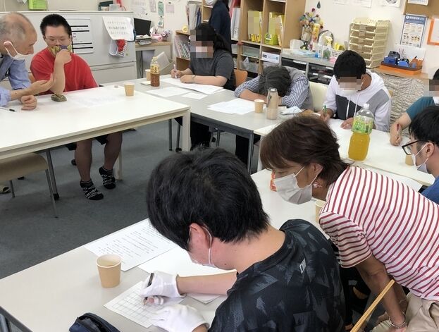ここ、みなくるはうす光の3階にて「講師」歌人の瀬戸内光さん、松本さんをお招きして行いました。就労さん、B型さんの利用者さんも参加されみんな一生懸命考えて、短歌をお作りになっておられました