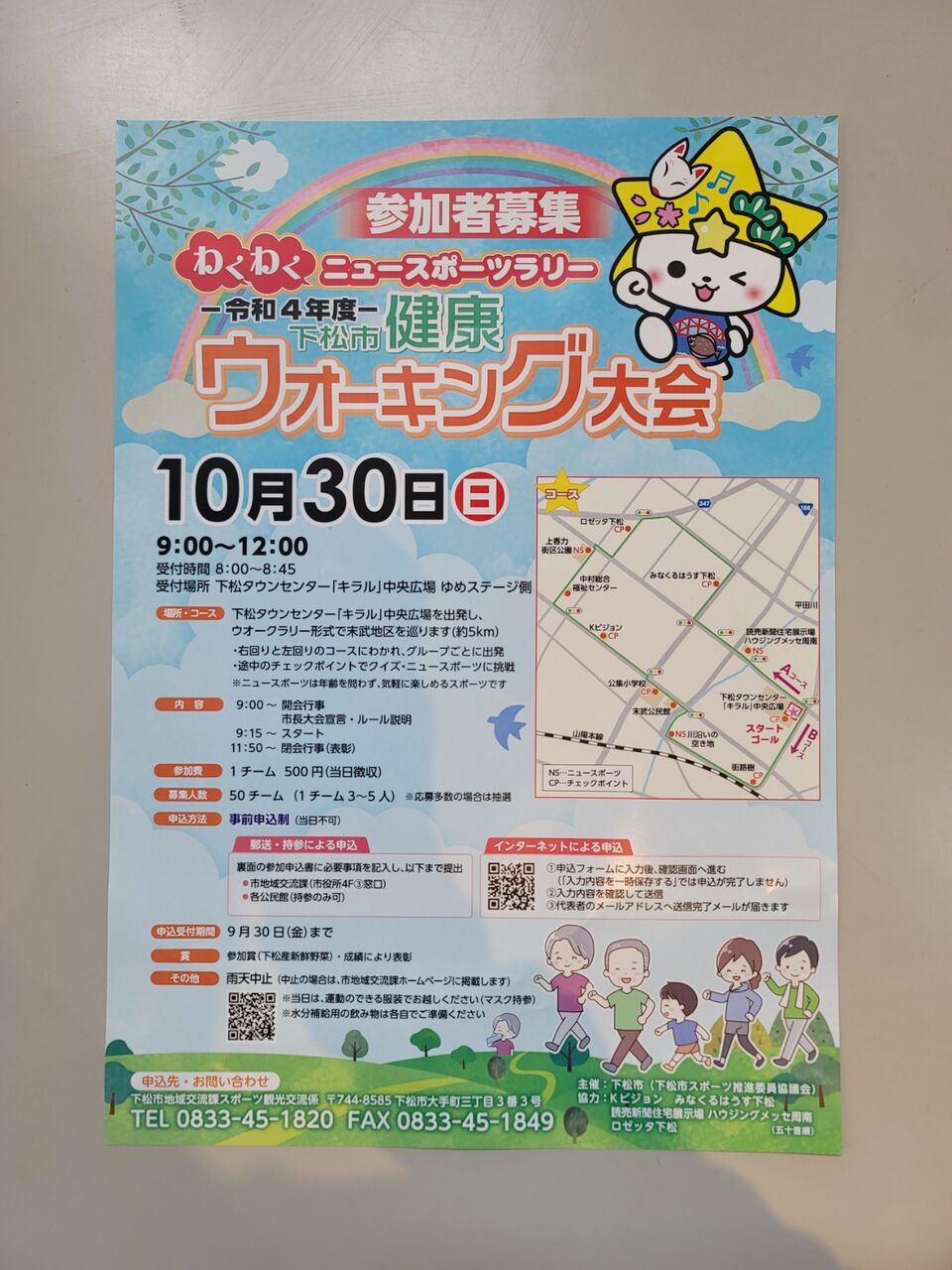 下松市健康ウォーキング大会が開催です。みなくるはうす下松は、チェックポイントとしての、協力依頼がありました。52組、200人の方が参加されて、とても賑やかな大会でした。