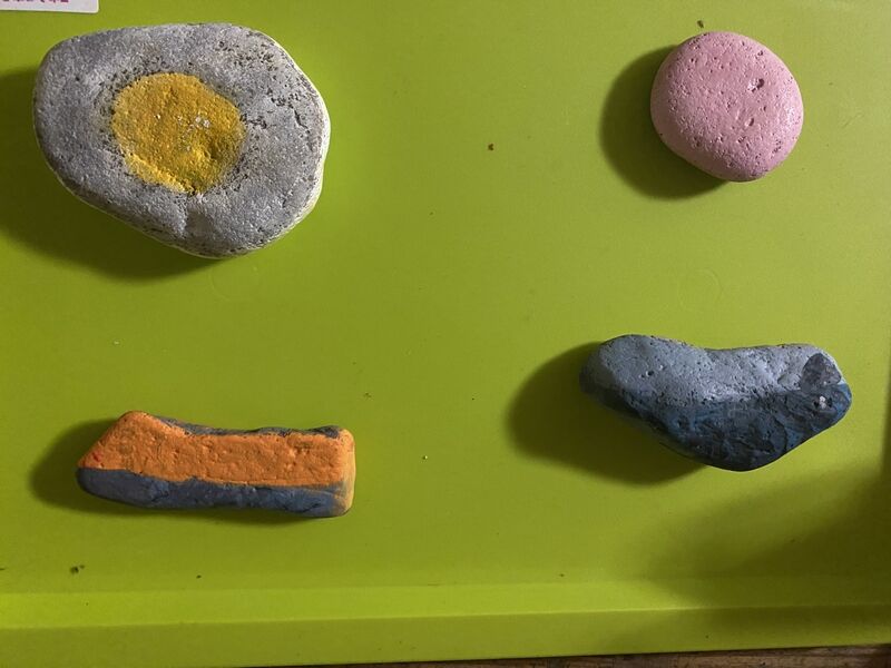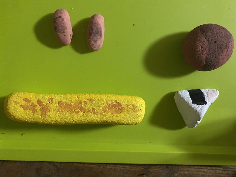 それぞれ石の形に合ったものに絵の具を塗って作りました。