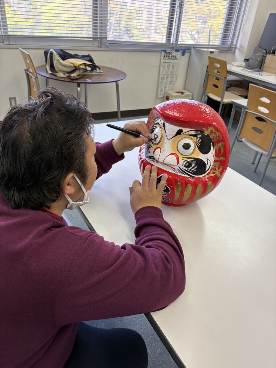 就職を祝い、恒例の“だるまの目いれ”を行いました。