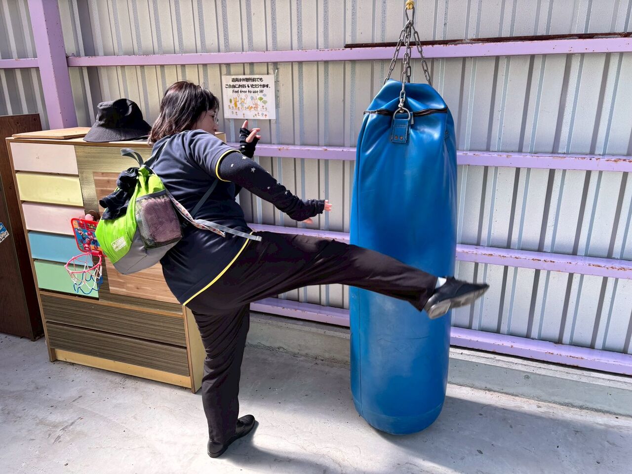 ご飯を頂いた場所では、なんとサンドバックが置いてありました!職員や利用者さんが、かっこいい蹴りやパンチを披露してくださいました!!